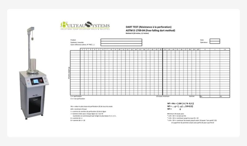 | Resistance à la perforation (en g) | La résistance à la perforation est la capacité d'un film à ne pas se perforé lorsqu'il est confronté à un objet pointu, la methode de test s'appelle le DART TEST et correspond à la norme ASTM D 1709 |