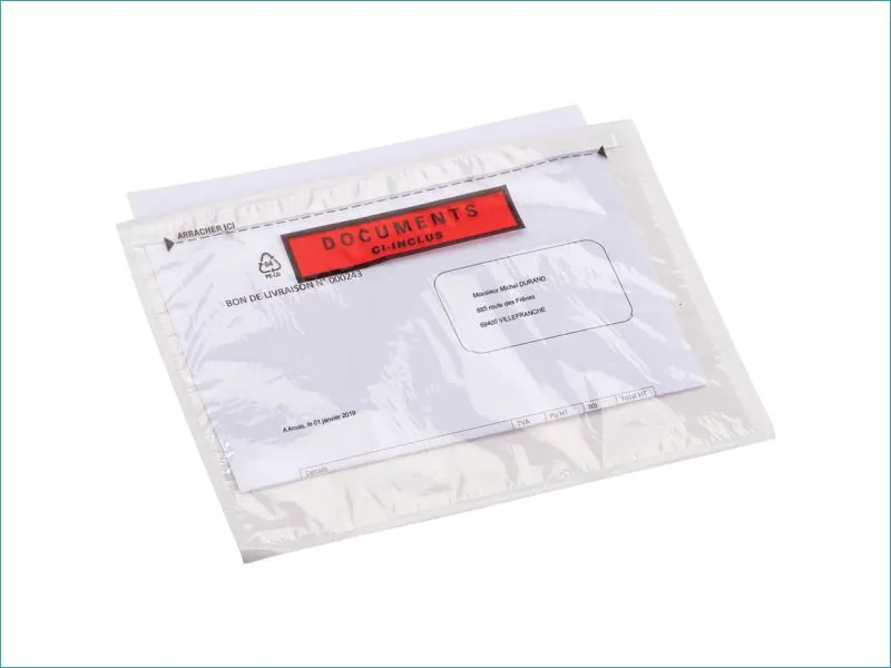 Fabriquée en polyéthylène et papier blanc 40g/m², avec un adhésif hotmelt puissant, elle est conçue pour accueillir un format A4 plié en deux. Personnalisable en impression noire sur fond rouge, elle est conditionnée par 1000 pour répondre à vos besoins professionnels. Protège vos documents de livraison