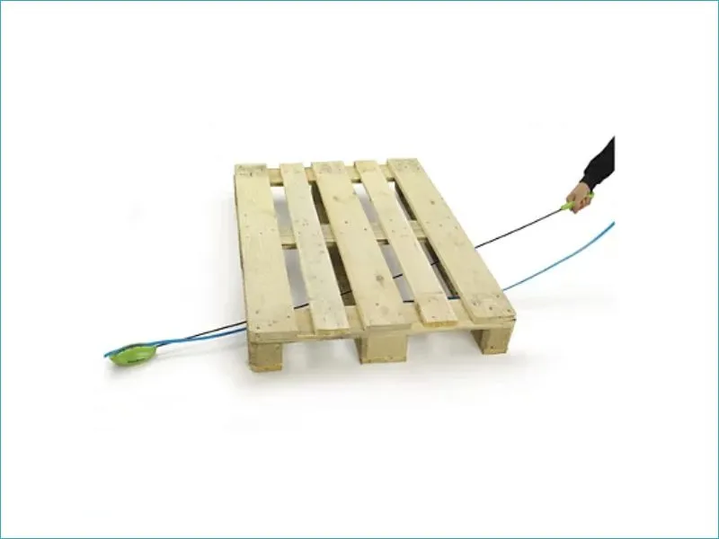 Insérer le feuillard dans l'encoche prévue à cet effet. Glisser sans effort le passe-feuillard sous la palette. Récupérer le passe-feuillard à l'extrémité de la palette.
