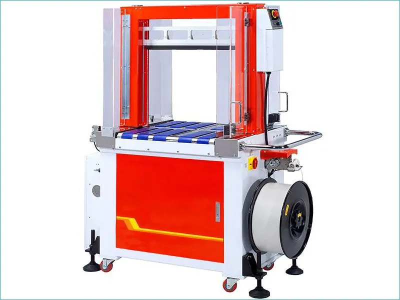 La machine à cercler TP702B est une cercleuse tout automatique à bandes motorisées qui peut être intégrée dans une ligne d’emballage.