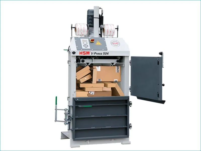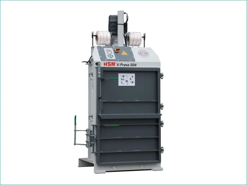 Optez pour la solution la plus économique de traitement de vos déchets ! Le modèle HSM V-Press 504 peut faire des balles pesant jusqu'à 60 kg. Compactage économique de vos balles papier, cartons, et plastiques. Peut faire des balles pesant jusqu'à 60 kg. Les presses verticales conviennent parfaitement, de par leurs dimensions, leur coût et leurs caractéristiques, à l’industrie et au commerce. Ces presses à balles vous permettent de réduire le volume des matériaux d’emballage directement sur place jusqu’à 95 % de leur volume initial. Chargement idéal des poids lourds. Utilisation de récupération de chaleur dans la production. Les emballages peuvent devenir un problème. Si l’on considère le matériel d’emballage usagé comme faisant partie d’une chaîne de recyclage, celui-ci devient une matière première de récupération. Comment traiter efficacement et compacter cette matière première ? HSM vous offre des solutions pour atteindre cet objectif grâce à une technologie à la fois approuvée et n